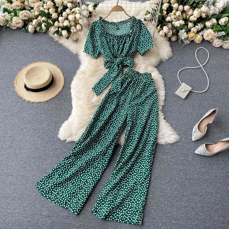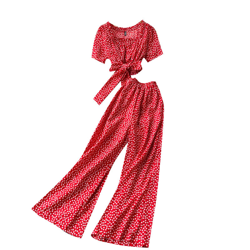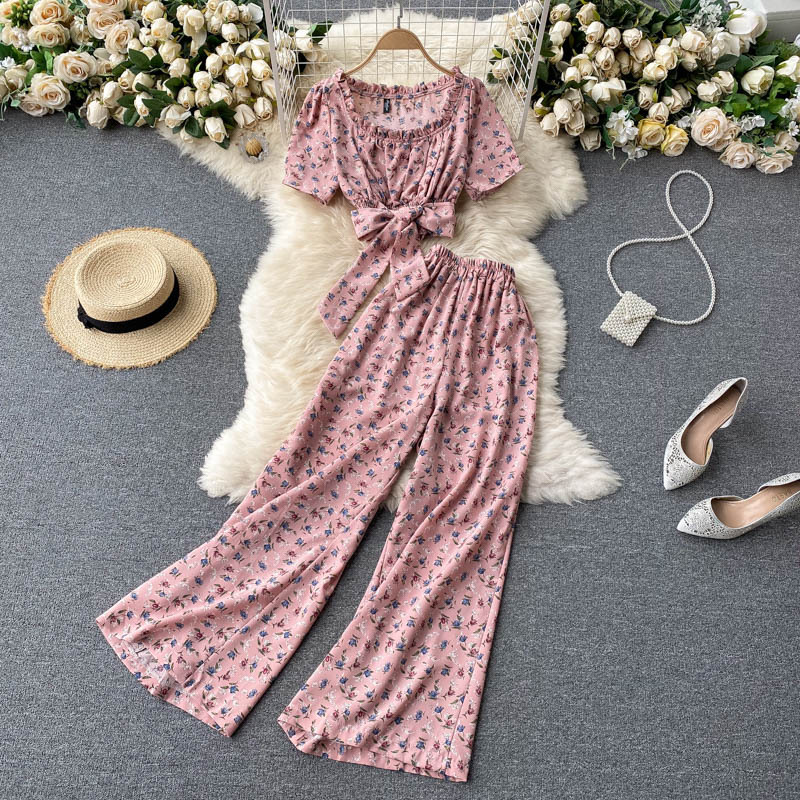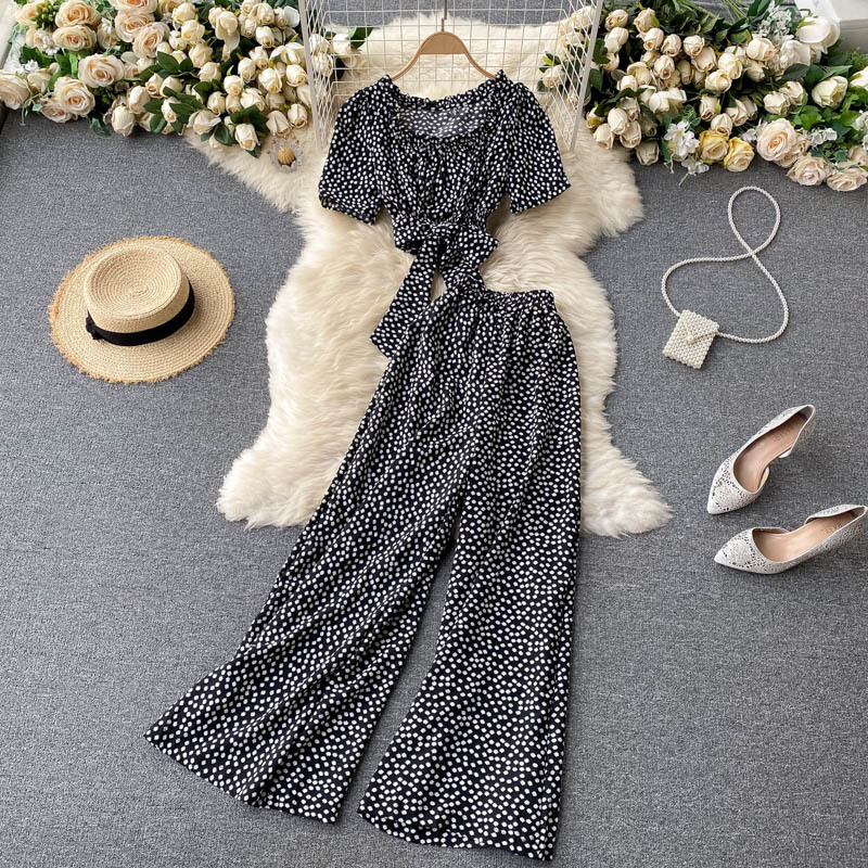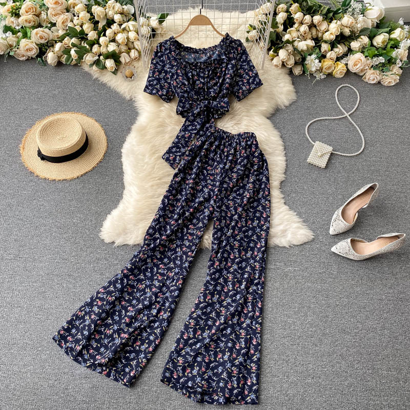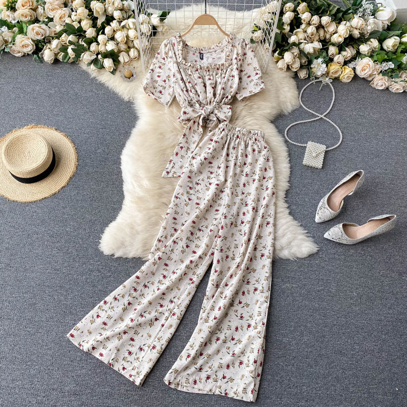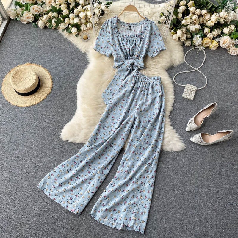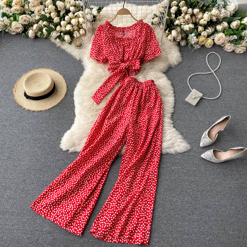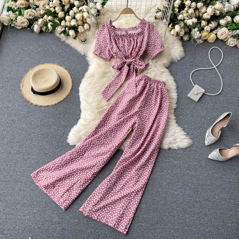 Two-piece Suit Of Round Neck Slim-fit High-waist Wide-leg Pants With Sweet Wood Ears